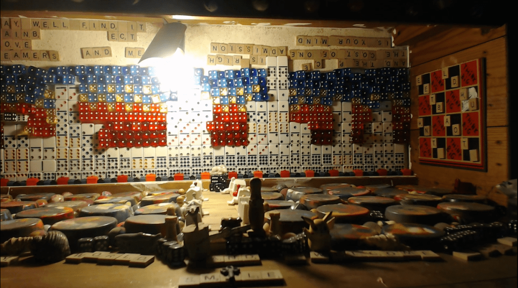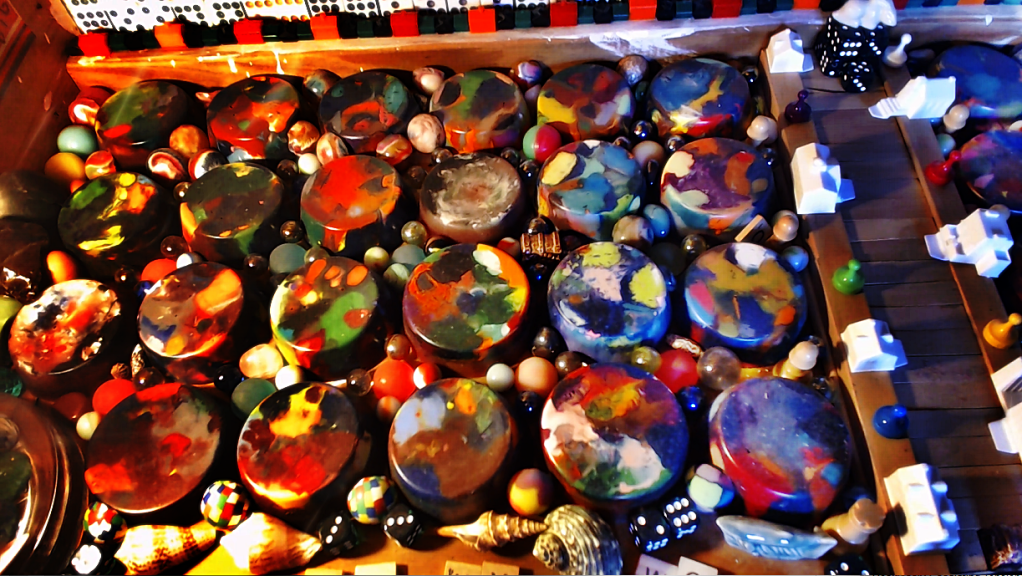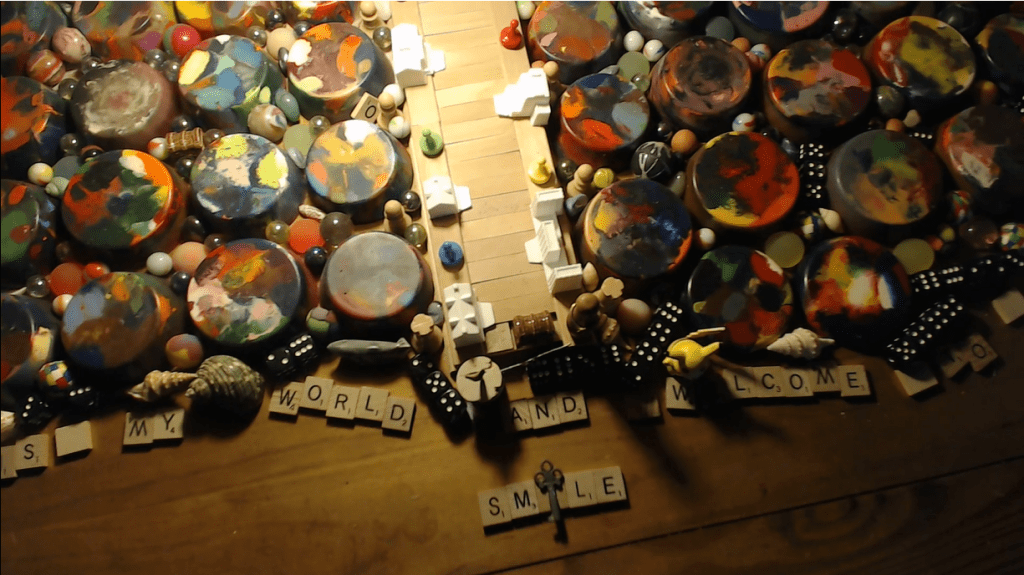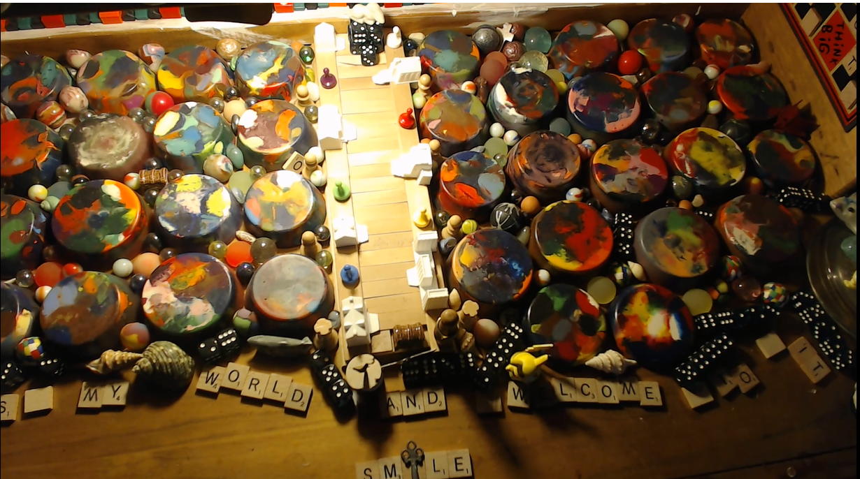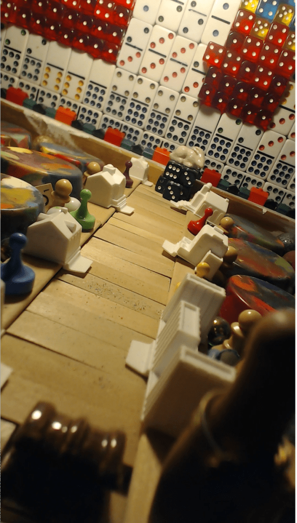 I got the idea for this project one day in college when I was doing some homework in the library. I thought it would be cool to create a city-scape image using dice and dominoes as a colorful, starry night sky and lighted-up skyscrapers, respectively. Over time the idea grew to include a colorful shore with a pier. I figured since I was already using childhood toys to create the background, the foreground should follow that same theme. That’s why the pier is made out of Jenga blocks and Scrabble tile-holders, with pieces from Clue and The Game of Life as buildings dotting the sides. The water is represented by melted down crayons, with marbles and other assorted knick knacks acting as the treasures of the sea floor. There are Monopoly houses and hotels lining the landscape to give the city more depth. I wanted to give the impression that, with the time and resources, this is how a kid might express their view of the world.