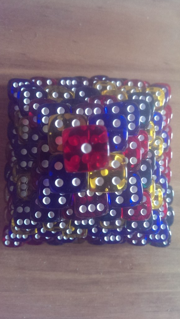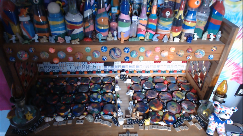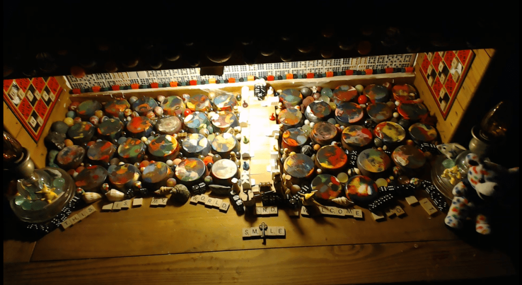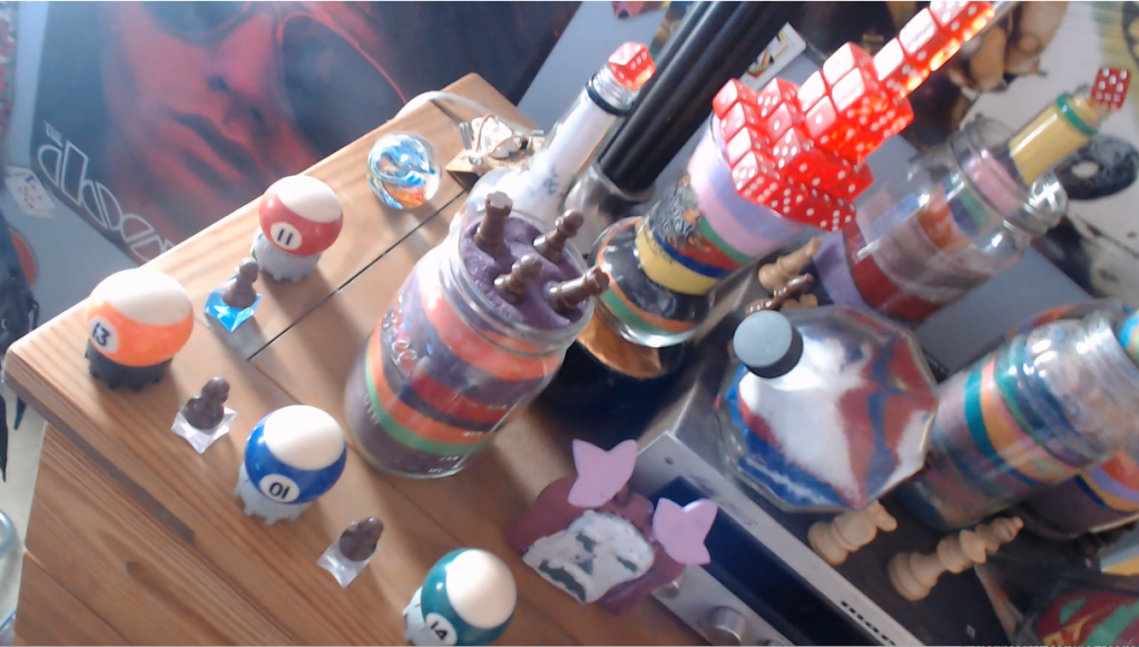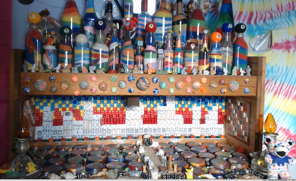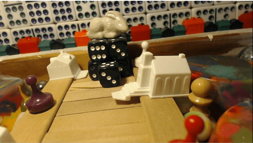 I got the idea for this project one day in college when I was doing some homework in the library. I thought it would be cool to create a city-scape image using dice and dominoes as a colorful, starry night sky and lighted-up skyscrapers, respectively. Over time the idea grew to include a colorful shore with a pier. I figured since I was already using childhood toys to create the background, the foreground should follow that same theme. That’s why the pier is made out of Jenga blocks and Scrabble tile-holders, with pieces from Clue and The Game of Life as buildings dotting the sides. The water is represented by melted down crayons, with marbles and other assorted knick knacks acting as the treasures of the sea floor. There are Monopoly houses and hotels lining the landscape to give the city more depth. I wanted to give the impression that, with the time and resources, this is how a kid might express their view of the world.