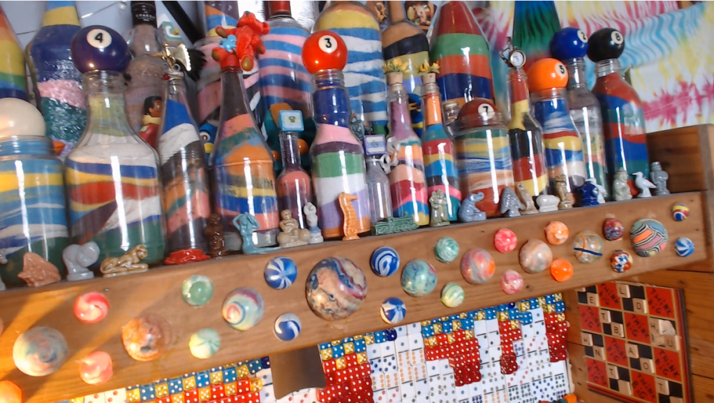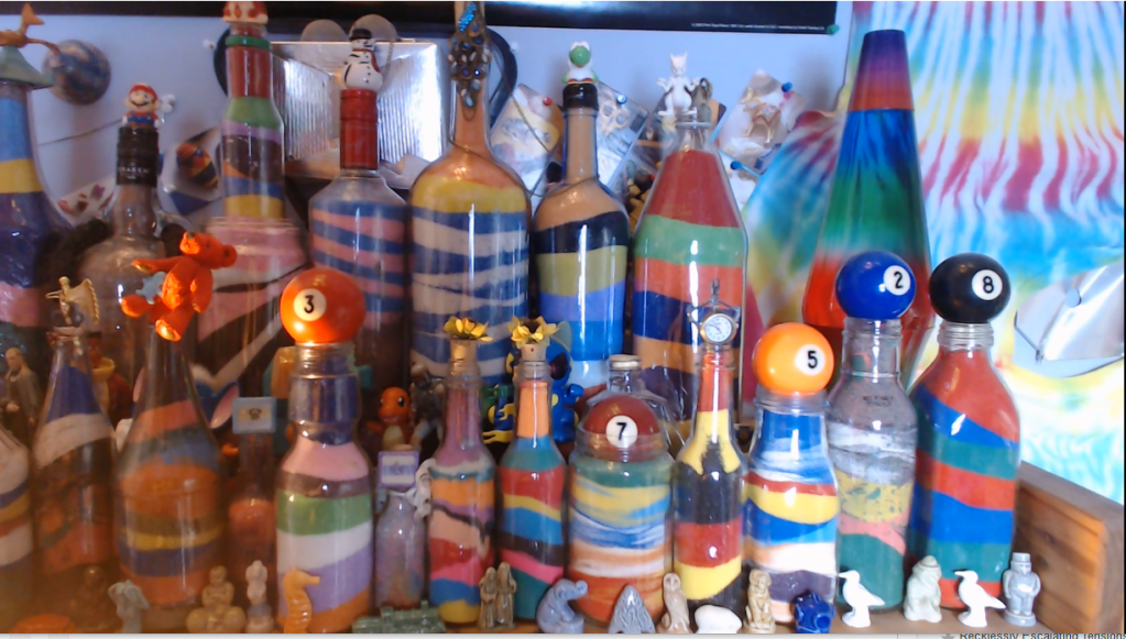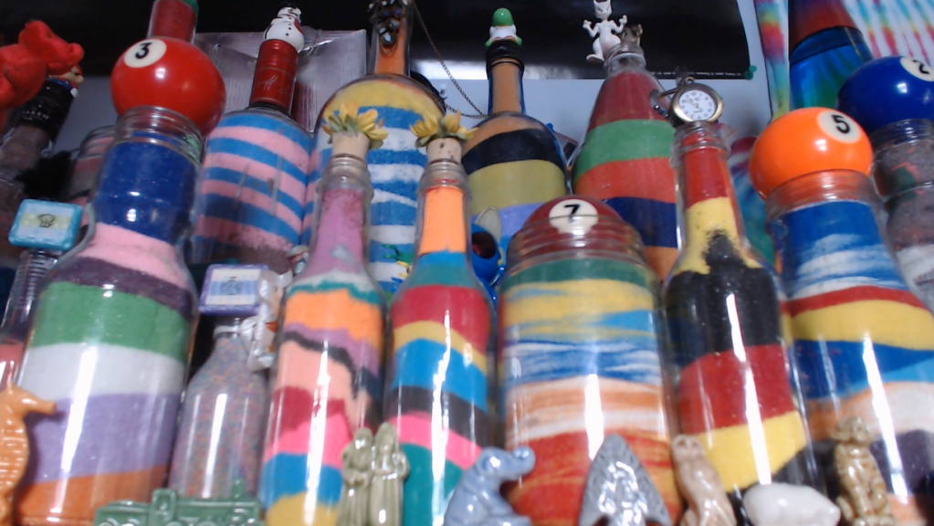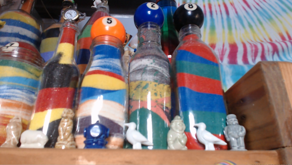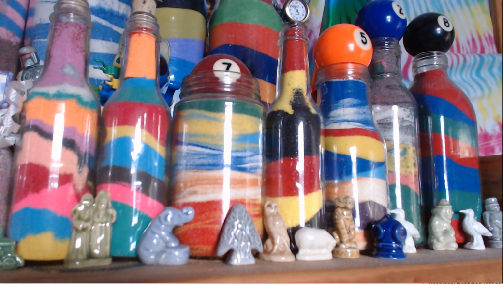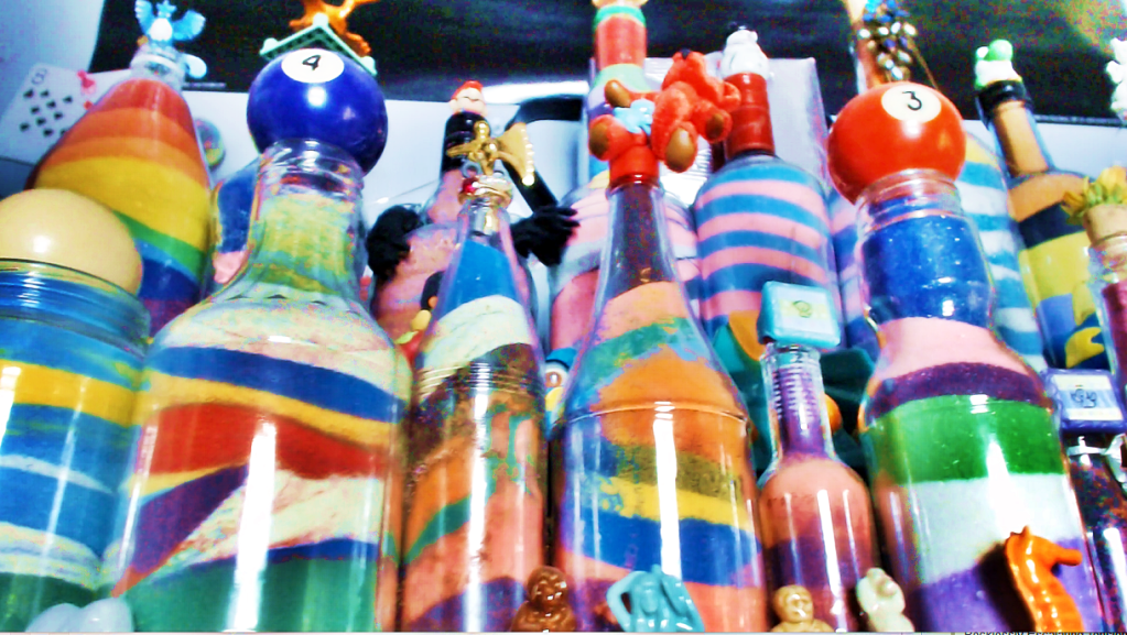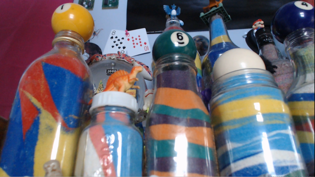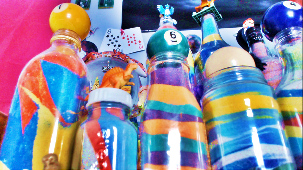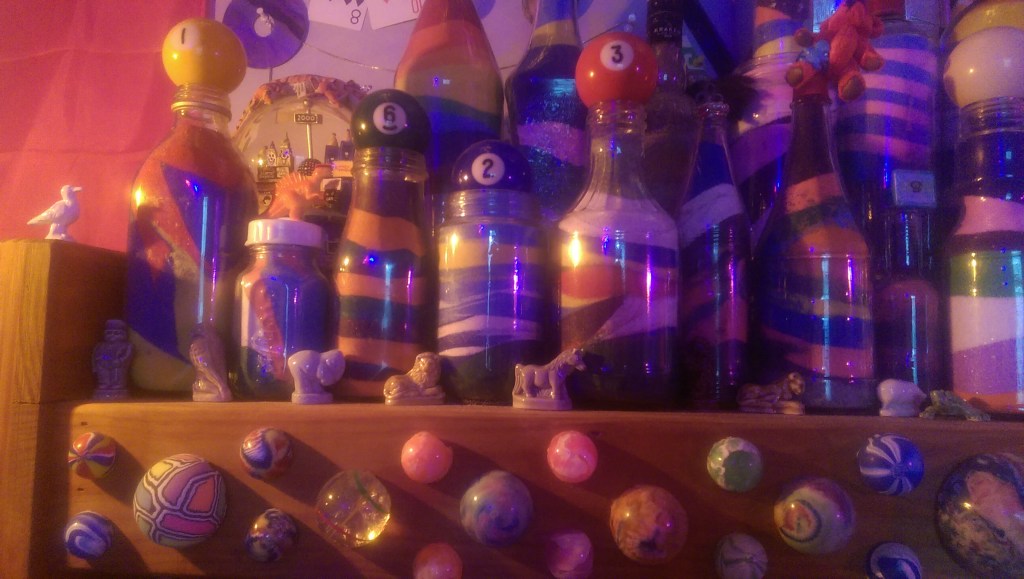 Once I was done with the main section, I wanted to do something interesting on the top level as well. I always loved getting bottles filled with colored sand at local fairs when I was a kid, so I filled some containers with that. Then I used the other toys I had laying around, including bouncy balls, the ornaments from Red Rose brand tea boxes, chess pieces and billiard balls.