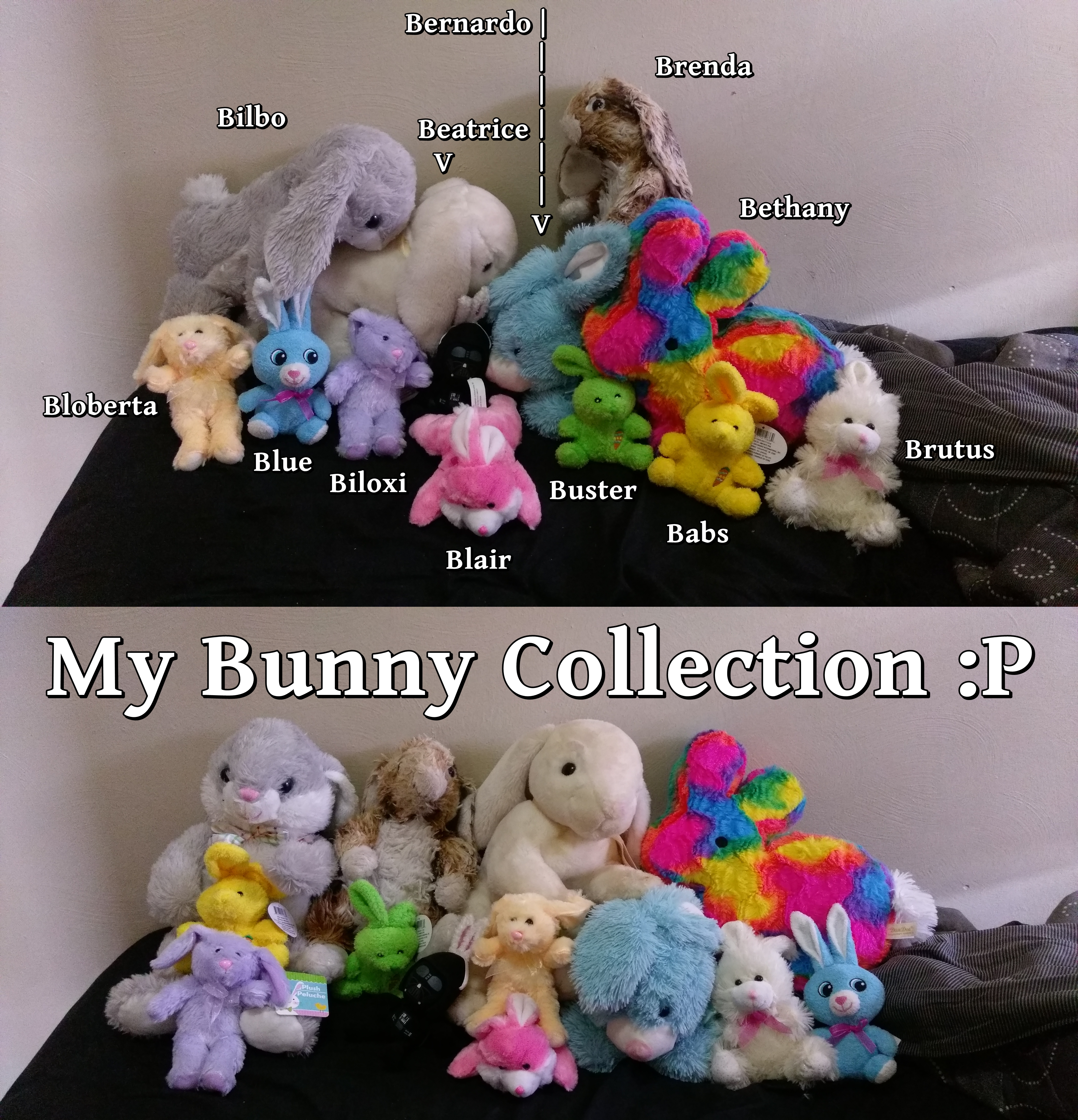 The brown one, named Brenda Quinley, is my favorite. Unlike the others, she was not a gift; I rescued her from a horrible goodwill store where the merchandise was badly mishandled. Everything was kept in these blue containers, and items as incompatible as kitchen glasses, VHS tapes, clothes, single shoes and action figures were tossed in carelessly. The customers greedily pawed over everything, tossing around whatever they didn’t snatch into their carts. Every now and then the ornery employees would scream at us to get out of the way while they wheeled in a new plastic bin of thrown together junk. The customers would immediately swarm their new trough like a bunch of gluttonous hogs, just pulling and tugging at everything within reach. Seeing this adorable little bunny in that awful place, I knew I had to save her.