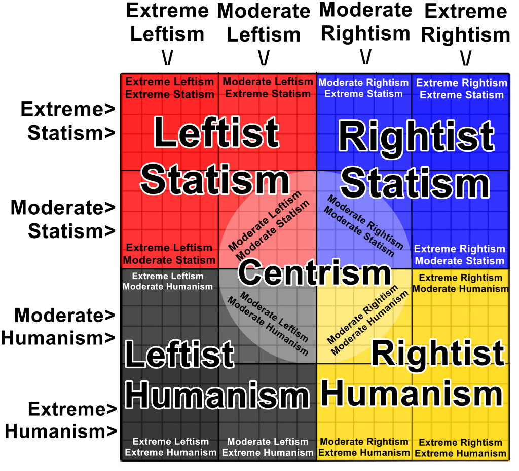 In the last post of this series, we looked at two different axes representing economic and social organization. In this section we will combine the two into four distinct quadrants, each encompassing their own various ideologies. The Political Compass designates these as “Right-Authoritarianism,” “Right-Libertarianism,” “Left-Libertarianism” and “Left-Authoritarianism.” I will refer to them as such for the sake of convenience and familiarity though I personally believe “Right/Left Statism” and “Right/Left Humanism” are more accurate names.