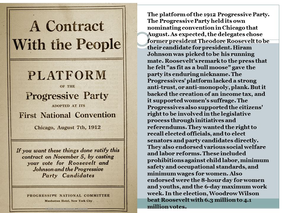 The National Progressive party, committed to the principles of government by a self-controlled democracy expressing its will through representatives of the people, pledges itself to secure such alterations in the fundamental law of the several States and of the United States as shall insure the representative character of the government.
