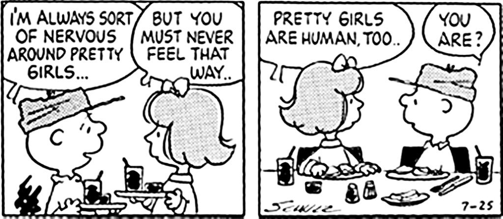 With regard to the character herself, I love how Peggy Jean calls Charlie Brown “Brownie Charles.” It reminds me of college when the guys in my dorm started calling me by an unasked-for nickname. I always hated it, but then when I was introduced to some nice young women from my roommate, and they only knew to call me by this nickname, suddenly it didn’t bother me anymore. Coming from them, it sounded like an endearing pet name rather than dudebro teasing, and I was happy for it. “Brownie Charles” is such an adorable pet name and I can just imagine a sweet little girl saying something like that, even without Charlie Brown’s botched introduction. Judging by her words in the strip, Peggy Jean seems to be an incredibly good-natured, trusting person, wise beyond her years in many ways. Someone who’s unsuperficial and willing to see the good in a down-on-his-luck, wishy washy guy like Charlie Brown.