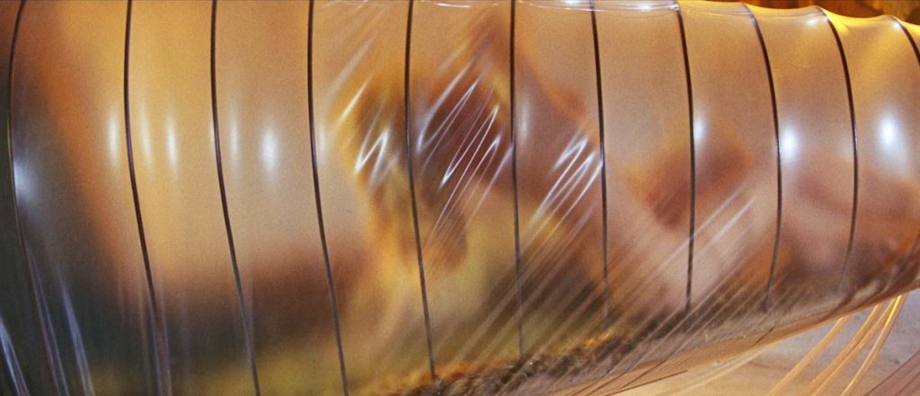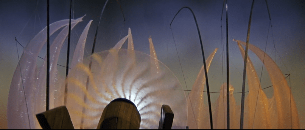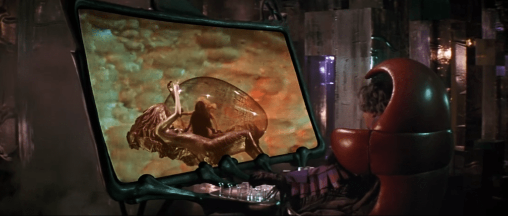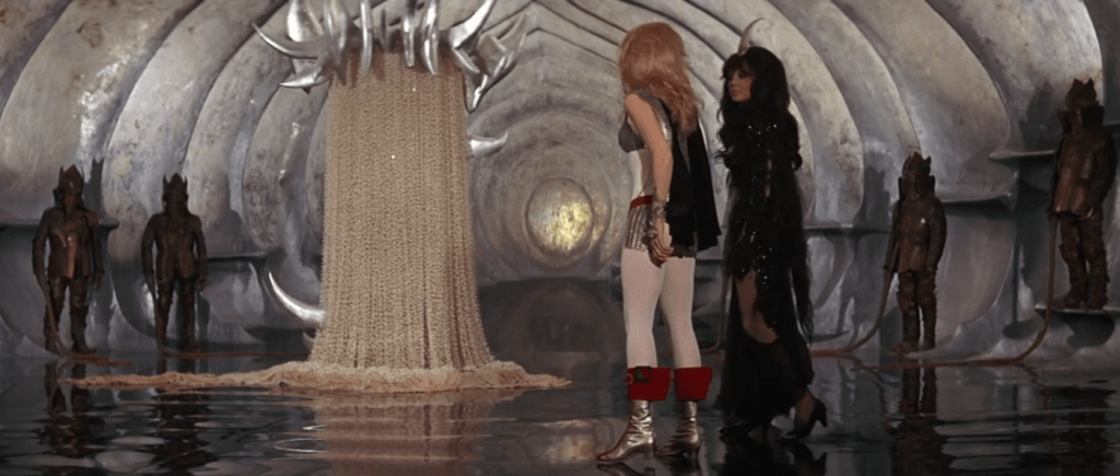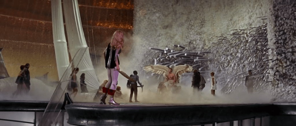 This motif of defiled childish imagery is overshadowed by a series of phallic symbols once the Catchman comes to save our heroine. His vessel is composed of a giant drill eternally chasing a set of labia-shaped sails. The pointy tips of those sails suggestively perk up just before he and Barbarella have sex, then relax once the deed is done. He gives Barbarella a set of furs with a long tail, which evocatively gets stuck in her spaceship’s circular door. These sexual references will continue through the rest of the film. The most famous example is probably the giant hookah in which women inhale the “essence of man.” Several of the walls in the city of Sogo contain numerous metallic poles hanging flaccidly, as well. Barbarella also hides a gun in the front of Pygar’s feathered loin, and offers multiple double ententes. (“A great many dramatic moments involve screaming.”)