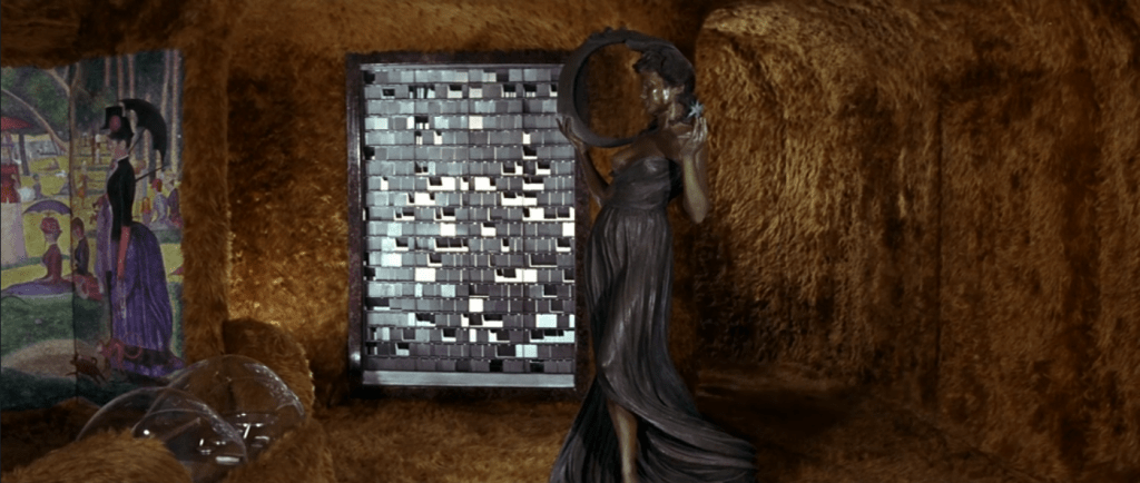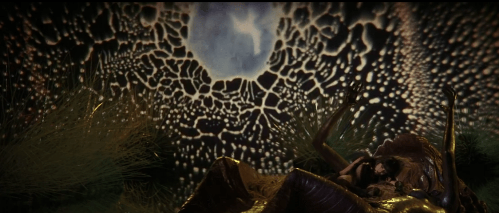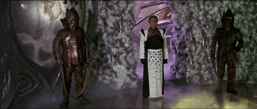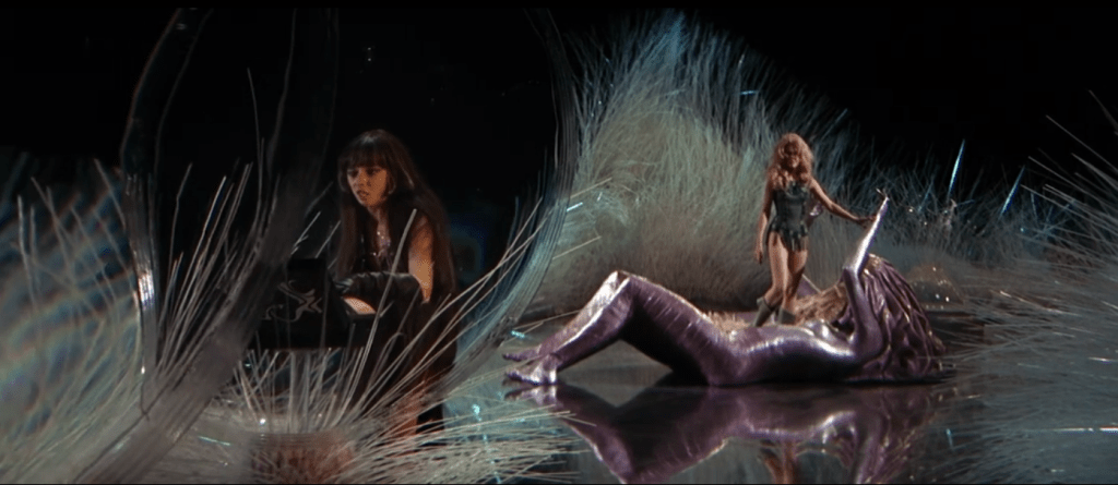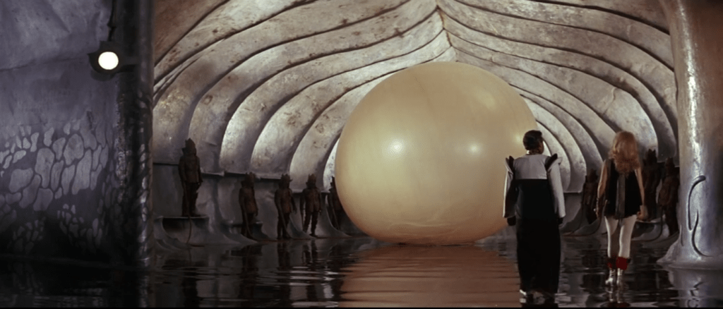 By far the crowning achievement of Barbarella lies with its stellar production values. Everything from the sets, to the costumes, to the soundtrack is silky smooth and gorgeously realized. This is what made me want to keep revisiting the film despite not being gripped by the plot in my initial screening. I wanted to come back and just be a part of this beautiful universe again, where the cosmos are rendered as psychedelic graphics and the essence of evil looks like the wax mixture in a lava lamp.* I have never seen a greater blending of the mystical and the scientific as exists in the city of Sogo, where laser cannons and orgasm machines can exist side by side with invisible keys to impossible dreamscapes. Every time I gave this film another chance, I’d notice some new detail in the scenery I hadn’t before and find myself awed by it. It’s the only time, at least that I’m aware of, where an America release has ever matched the stylized composition of the best Italian films of this era. (We’ll look at some of those in later entries of this series.)