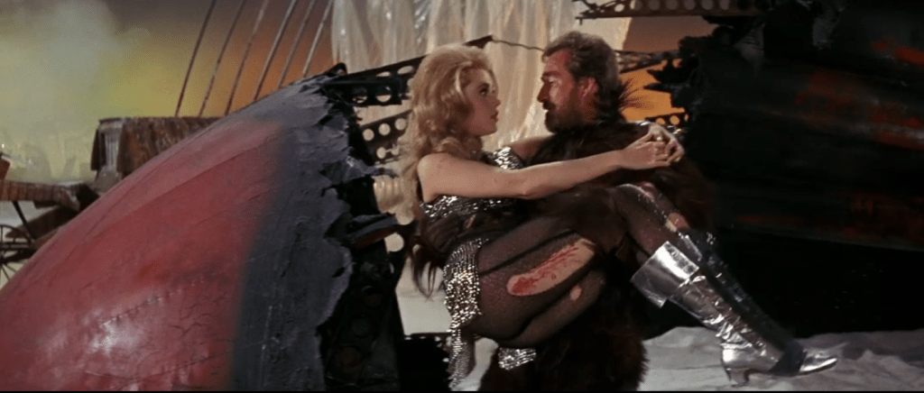 Now, as much as I’ve come to love it, Barbarella is far from a perfect film. The biggest issue I have is the episodic plot. There are so many instances of our heroine finding herself trapped only to be saved at the last minute by someone else. That means the story never really gains momentum; it’s full of one too many stops and starts for each scene to flow into the next. This is what I meant earlier when I said Barbarella’s innocence is partially a hindrance to the movie. Since she’s a naive soul from a world without weapons, our protagonist is often incapable of defending herself from the cruel inhabitants of Lythion. It makes sense from a narrative perspective, yet it constantly undercuts the ability of the narrative to maintain a gripping pace. (How’s that for irony?) In addition, there’s quite a bit of exposition peppered throughout the script. This was most apparent during the scene with Dildano, leader of the resistance on Sogo. I like to think his excessively disorganized operation was meant to be a thoughtful critique of the counterculture revolutionaries of the ’60s, but I’d be lying if I said I don’t get bored during that particular interaction.