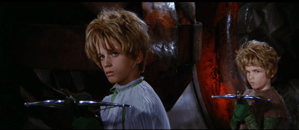 This may not have been the explicit intention of the production team, but I noticed many nods to youthful innocence in the first act of the film. For example, it was always my impression that Barbarella’s ship was meant to be evocative of an inside-out stuffed animal. I like to imagine the fluffy lining of the ship’s interior was designed to be comforting to the touch. (I know if I were caught in an electromagnetic storm, I’d want to cling to something plushy for dear life rather than cold, hard metal.) Her ship’s controls are large and polygonal, which reminded me of children’s toys as well. It goes back to the theme I alluded to earlier, about Barbarella as an innocent figure, naive to the malevolent intentions of the people in uncharted space whom she’s about to encounter. I may be over analyzing, but when she arrives on the planet Lythion, I thought the young girls taking her skiing were meant to be a reference to the White Queen from The Lion, the Witch and the Wardrobe. (Just reverse the ages of the captor and captive.) The young boys and black rabbit in their lair were similarly distorted versions of characters from Peter Pan and Alice in Wonderland, respectively. If that’s too much of a stretch, certainly the killer dolls themselves are a straightforward metaphor of twisted childhood innocence.